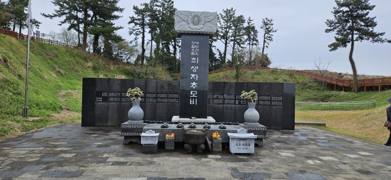 섯알오름에 있는 제주4.3사건 희생자 추모비다. 간혹 사람들이 단체로 방문하여 추모하기도 한다.